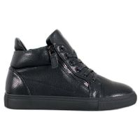 Trampki na platformie Sergio Leone w kolorze czarnym to bardzo wygodne obuwie, idealne do codziennego użytku przez miłośniczki sportowego stylu. Wierzchnia część obuwia wykonana została z solidnej jakości tworzywa skóropodobnego, we wnętrzu obuwie wyścielone jest wkładką ze skóry naturalnej. Buty posiadają zapięcie na zamek, jak i sznurowanie.