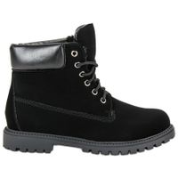 Klasyczne traperki damskie wykonane z zamszu ekologicznego w czarnym kolorze. Buty wiązane na sznurówki, z cholewką o wysokości sięgającej ponad kostki, wykończoną skórą ekologiczną. Będą doskonałe na jesień i zimę. Ich uniwersalny kolor sprawia, że pasują do wielu codziennych stylizacji w casualowym stylu.