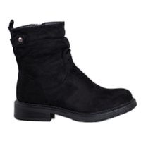 Zamszowe damskie botki w kolorze czarnym, powstały z ekologicznego tworzywa. Cholewka sięga do kostki i jest na górze delikatnie marszczona, a także udekorowana z tyłu poziomym paskiem z dżetem. Buty mają 3 cm szeroki i płaski obcas, a także zamek błyskawiczny ułatwiający ich zakładanie. Poza tym obuwie jest na grubszej podeszwie z syntetyku.