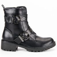 Czarne workery damskie od marki Sweet Shoes. Wykonane ze skóry ekologicznej. Cholewa ponad kostkę, zapięcie na suwak. Podeszwa z tworzywa sztucznego z bieżnikiem. Buty wyróżniają się dwoma ozdobnymi paskami z klamrami oraz dziurkami wykończonymi metalowymi kółkami. Będą doskonałe na jesień i zimę do stylizacji w rockowym stylu.