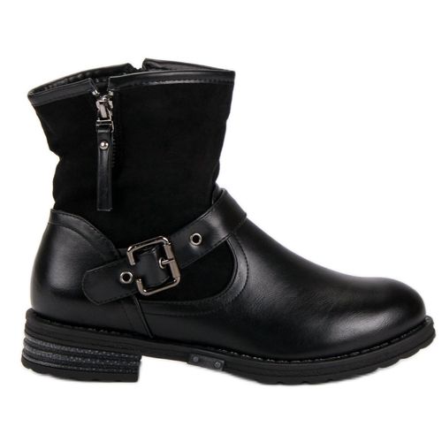 Damskie buty typu workery w kolorze czarnym, które idealnie sprawdzą się do wiosennych stylizacji. Wykonane są ze skóry ekologicznej w połączeniu z zamszem ekologicznym. Elementami ozdobnymi są dodatkowa sprzączka oraz suwak, które dodają butom rockowego charakteru. Buty mają dość wysokie cholewki, sięgają ponad kostkę.