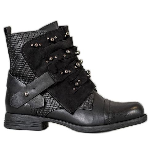 Czarne workery Forever Folie to idealne obuwie dla miłośniczek rockowego i casualowego stylu. Obuwie wykonane zostało z tworzywa skóropodobnego, z dodatkiem wkładki wykonanej z ekologicznej skóry. Buty posiadają liczne dżety, co bez wątpienia nadaje im niepowtarzalnego i niebanalnego charakteru. Zabudowany i miękki zapiętek zapewnia komfort użytkowania obuwia.