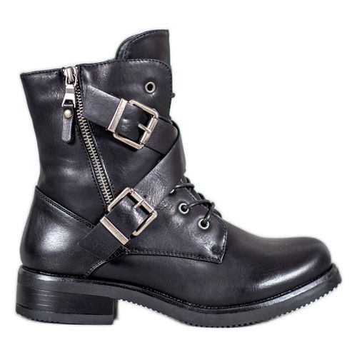 Workery damskie wykonane z tworzywa skóropodobnego mają uniwersalny czarny kolor. Cholewki sięgające za kostkę mają wiązanie na sznurówki, praktyczny suwak od wewnętrznej strony oraz drugi - dekoracyjny. Buty te mają także paski z klamrami dodające im charakteru oraz wygodny szeroki obcas o wysokości 3,5 cm.