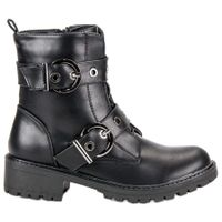 Czarne workery damskie od marki Sweet Shoes. Wykonane ze skóry ekologicznej. Cholewa ponad kostkę, zapięcie na suwak. Podeszwa z tworzywa sztucznego z bieżnikiem. Buty wyróżniają się dwoma ozdobnymi paskami z klamrami oraz dziurkami wykończonymi metalowymi kółkami. Będą doskonałe na jesień i zimę do stylizacji w rockowym stylu.