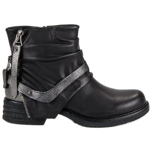 Czarne workery damskie wykonane z najwyższej jakości skóry ekologicznej. Buty zapinane na wygodny suwak, na niewysokim obcasie. Podeszwa z bieżnikiem to gwarancja pewnego kroku na każdej powierzchni oraz podczas kiepskiej pogody. Na zapiętku aplikacja w kolorze starego srebra, z postarzanym zamkiem.