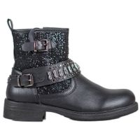 Workery Bestelle w kolorze czarnym to bardzo modne i wygodne obuwie, wykonane z wysokiej jakości skóropodobnego tworzywa. Buty są bardzo bogato zdobione przez ozdobną sprzączkę, liczne dżety oraz kryształki. Dzięki delikatnemu ociepleniu obuwie idealnie sprawdzi się w codziennym użytkowaniu w sezonie jesień/zima.