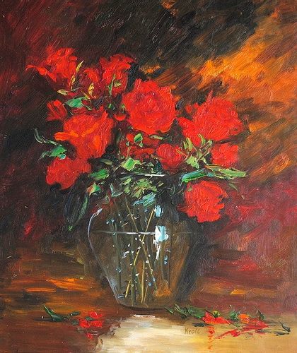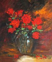 Ręcznie malowany obraz olejny na płótnie za pomocą pędzla! Dostępny bez blejtramu. Sygnowany i werniksowany. Przedstawia czerwone róże w szklanym wazonie. Cechuje się subtelną stylistyką i niepowtarzalną prezencją. Obraz w rozmiarze 50x60cm!
