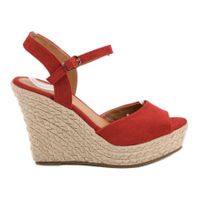 Czerwone sandałki wykonane z ekologicznej skóry najwyższej jakości. Bardzo wysoka podeszwa buta została ozdobiona plecionką ze sznurka w kolorze naturalnym. Materiały, z których wykonano buty cechują się wysoką jakością, która gwarantuje im trwałość, a także duży komfort użytkowania. Buty mogą stanowić elegancki dodatek do codziennych kreacji.