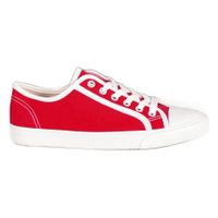 Czerwone trampki damskie z białymi elementami, to lekkie buty w sportowym stylu. Solidne podeszwy z 2-centymetrową platformą stanowią doskonałą izolację od podłoża, mają właściwości antypoślizgowe i zapewniają wygodę podczas chodzenia. Klasyczne sznurowanie z przodu umożliwia odpowiednie dopasowanie cholewek do stopy.