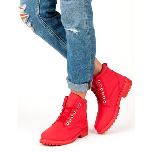 Traperki Mckey w kolorze czerwonym wykonane są ze skóry ekologicznej. Jaskrawy kolor przyciąga wzrok, dlatego są to świetne buty dla kobiet, które lubią wyróżniać się z tłumu. Gruba podeszwa z bieżnikiem zapewni wygodę nawet w trakcie długiego chodzenia podczas spaceru, zakupów, czy pieszych wędrówek.