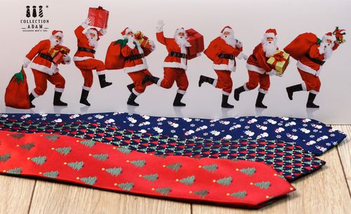 Czerwony świąteczny krawat w choinki.