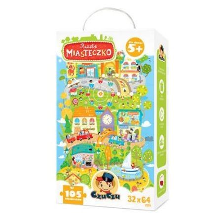 Zapraszamy na wycieczkę do Miasteczka CzuCzu! W pełnym atrakcji i przygód Miasteczku każdy znajdzie coś dla siebie. Lot balonem, przejażdżka na skuterze, pyszne lody kokosowe w kawiarence… a może pomoc w schwytaniu złodzieja? Zaskakująca ilością szczegółów układanka ma 105 elementów. Wymiar puzzli po ułożeniu to 32x63 cm.