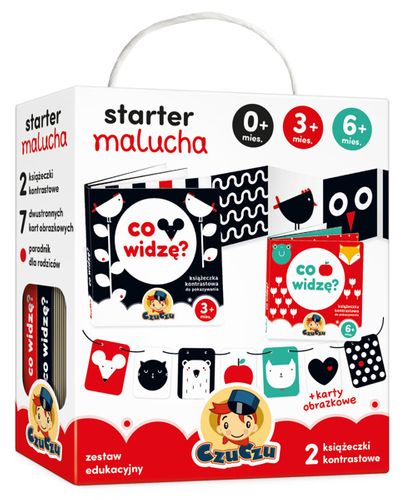Nigdy nie jest za wcześnie na wspólne odkrywanie świata! Starter malucha to zestaw kontrastowych kart i książeczek do pokazywania, który sprawdzi się w pierwszym roku życia dziecka. Do zestawu dołączyliśmy poradnik z informacjami na temat rozwoju wzroku i pomysłami na wspólną zabawę. To świetny pomysł na prezent dla rodziców niemowląt.