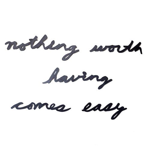 5 trójwymiarowych, metalowych słów w języku angielskim do zamocowania na ścianie przy pomocy taśmy dwustronnej. Dekoracja w czarnym kolorze doskonale urozmaici jednokolorową, gładką ścianę i stworzy niepowtarzalne miejsce, które będzie mogło w pewien sposób motywować nas do działania. Te słowa podkreślają sens każdego wysiłku i trudu, jaki podejmujemy w różnych życiowych sytuacjach, bo to, co ważne i wartościowe, nigdy nie przychodzi nam lekko.