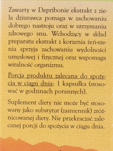 Ze względu na zawartość ziela dziurawca Depribon pomaga w zachowaniu dobrego nastroju i utrzymania zdrowego snu. Ze względu na zawartość korzenia żeń-szenia pomaga w zachowaniu wydolności umysłowej i fizycznej. Wspomaga witalność organizmu.