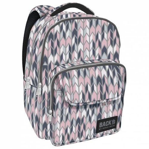 Plecak BackUP model L 11 w niezwykle elegancki, geometryczny wzór w stonowanych, pastelowych odcieniach szarości, bieli i różu. Nazwa wzoru: eleganckie zygzaki. W zestawie brelok do kluczy - gratis.
