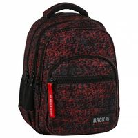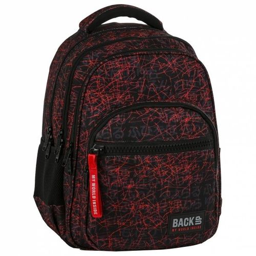 Plecak BackUP model M 47 czarne tło, japońskie litery w szarym kolorze i czerwone rysy, wzór jednocześnie spokojny, ale z niewątpliwą nutką szaleństwa, którą podkręcają czerwone dodatki. Ozdobą plecaka jest niezawodny zamek XXL.