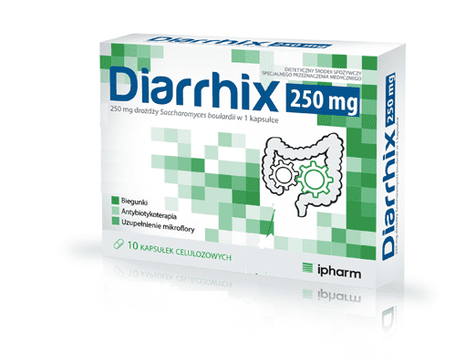 W odróżnieniu od innych probiotyków zawarty w DIARRHIX 250 mg szczep drożdży Saccharomyces boulardii wykazuje odporność na działanie antybiotyków dlatego też może być stosowany łącznie z antybiotykiem co bardzo ułatwia jego podawanie. Przyjmowanie Saccharomyces boulardii podczas antybiotykoterapii powoduje szybkie jego rozprzestrzenienie i namnażanie w całym układzie pokarmowym przez co blokuje rozwój bakterii chorobotwórczych min. Clostridium difficile, które to są głównym patogenem wywołującym biegunki.