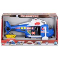 Niebieski Helikopter na baterie, emituje światło, wydaje dźwięki. Śmigłowiec wyposażony jest we wyciągarkę i otwierane drzwi.