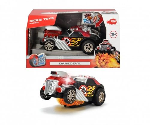 Racing Daredevil Samochód typu dragster w kolorze czarno - czerwono - szarym. Cechy:- Funkcja jazdy swobodnej lub szybkie ruszanie z miejsca - Efekty świetlne i dźwiękowe- Długość: 24 cm - Funkcja Try Me- Zasilanie: 3 baterie AA (baterie testowe w zestawie)Wiekod 3 lat