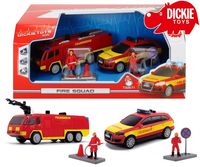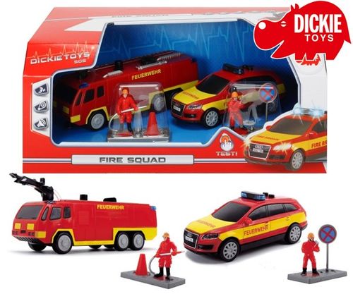 Drużyna strażacka firmy Dickie Toys SOS - Taki zestaw to marzenie każdego małego chłopca, pojazdy oraz strażacy gotowi do przeprowadzenia każdej akcji. Zestaw cechuje rewelacyjna jakość wykonania i ciekawe wzornictwo oraz bezpieczeństwo zabawy. W strażackim Audi zamontowane są sygnały świetlne i dźwiękowe.