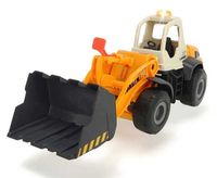 Spychacz bez napędu, ze światłem i dźwiękiem, ramię podnoszone na baterie, manualna szufla, otwarta kabina, baterie 2 x 1,5V w zestawie. Wymiar: 35 cm.