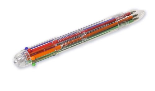 Długopis z wkładami w sześciu intensywnych kolorach: czarnym, niebieskim, zielonym, pomarańczowym, czerwonym, fioletowym.