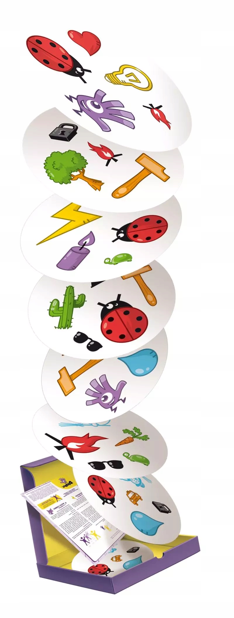 Znajdź parę i biegnij po zwycięstwo! „W domu, w szkole czy w plenerze – gigantyczna wersja Dobble rozrusza Wasze umysły i ciała! W tej pełnej napięcia grze na spostrzegawczość będziecie szukali symboli łączących dwie karty. Ale bystre oko to nie wszystko! Gdy już uda Wam się znaleźć i nazwać parę, czeka Was bieg, by wyprzedzić przeciwników”. „Dobble Giant” to zupełnie nowa odsłona popularnej serii doskonale łącząca umysłowe wyzwania i ruch. Opakowanie skrywa 20 kart o średnicy 24,5 centymetra, a instrukcja opisuje aż 4 warianty rozgrywek indywidualnych i drużynowych! Na czym to polega? W grze „Dobble” na 2 dowolnych kartach zawsze znajduje się dokładnie 1 wspólny symbol. Waszym zadaniem jest go odnaleźć! Jeśli nigdy wcześniej nie graliście w Dobble, wylosujcie 2 karty i połóżcie je odkryte na ziemi tak, żeby wszyscy gracze je widzieli. Poszukajcie powtarzającego się na nich symbolu (ten sam kształt i kolor – tylko wielkość symbolu może się różnić). Pierwszy gracz, który znajdzie odpowiedni symbol i głośno go nazwie, losuje i kładzie na ziemi kolejne 2 karty. Choć podstawowy mechanizm gry jest zawsze taki sam, szczegóły różnią się w zależności od wybranego wariantu. Właśnie dlatego Dobble są tak wciągające i nigdy się nie nudzą! Zawartość opakowania: • 20 okrągłych kart o średnicy 24.5 cm, • instrukcja.