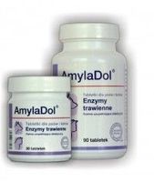 DOLFOS AmylaDol 30tab. - Enzymy trawienne. Tabletki dla psów i kotów. Karma uzupełniająca dietetyczna. Przeznaczenie:AmylaDol to dietetyczna karma uzupełniająca dla psów i kotów. Wyrównuje zaburzenia trawienia. Zalecana przy zewnątrzwydzielniczej niewydolności trzustki. Skład: maltodekstryna, stearynian magnezu Składniki analityczneBiałko surowe 0,5%, Włókno surowe 0,2%, Oleje i tłuszcze surowe 0%, Popiół surowy 35,4%, Wapń 0%, Fosfor 0%, Sód 0% Instrukcja stosowania:koty i małe psy: 1 tabletka dzienniepsy średnie: 2 tabletki dzienniepsy duże: 3 tabletki dziennie Podawać przed posiłkiem.Zalecany czas stosowania: od 3 do 12 tygodni, jednak w przypadku chronicznej niewydolności trzustki - przez całe życie zwierząt.Przed użyciem zaleca się konsultację z lekarzem weterynarii.