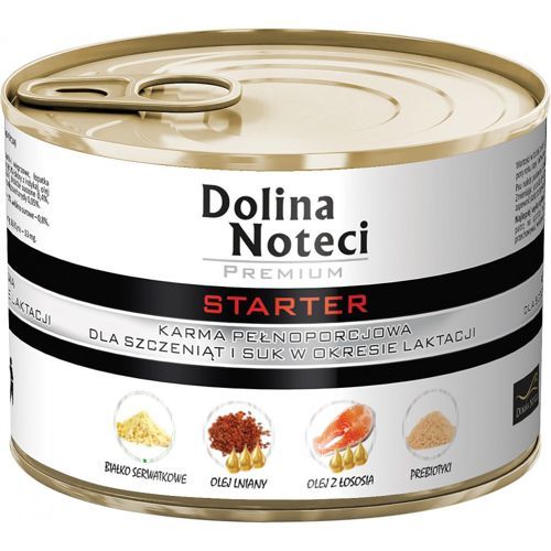 Karma Dolina Noteci STARTER ma w swoim składzie większą niż w innych karmach ilość wysokostrawnego białka i składników energetycznych, które są bardzo ważne dla suk w okresie laktacji i szczeniąt w okresie intensywnego wzrostu (do 2 m-ca życia). Precyzyjnie dobrano ilości składników mineralnych i witaminowych tak, aby zgodnie z nowoczesnymi normami i zaleceniami żywieniowymi zaspokajać specyficzne zapotrzebowanie organizmów w fazie intensywnego zapotrzebowania na witaminy i minerały. Karma jest wyprodukowana z surowców pochodzenia zwierzęcego, które gwarantują dostarczenie białka o wysokiej jakości i strawności. Surowce pochodzenia zwierzęcego dostarczają kwasów z rodzin n-6 i n-3, zaś olej z łososia jest cennym źródłem kwasów EPA i DHA, co zapewnia prawidłowy rozwój układu nerwowego oraz reguluje procesy zapalne.