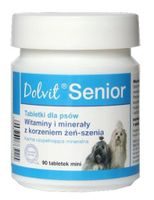 Właściwości: Dolvit Senior zawiera kompleksowy zestaw witamin i składników mineralnych, wzbogacony ekstraktem z korzenia żeń-szenia. Przeznaczony jest dla dojrzałych i starzejących się psów. Ułatwia osiągnięcie oraz utrzymanie dobrej kondycji. Zaleca się podawanie go również psom wyniszczonym, jak też w przypadkach żywienia źle zbilansowanymi pokarmami. Skład tabletki miniDodatki w 1 tabletceWitaminy, prowitaminy i chemicznie dobrze zdefiniowane substancje o podobnym działaniu: Witamina A 167 j.m. Witamina D3 13,3 j.m. Witamina E 4 mg Witamina B1 60,8 µg Witamina B2 100 µg Witamina B6 60 µg Witamina B12 0,24 µg Biotyna 6,6 µg Niacyna 420 µg Kwas pantotenowy 72,3 µg Kwas foliowy 2,7 µg Chlorek choliny 450 µg Mieszanki pierwiastków śladowych: Żelazo (siarczan żelaza(II) * H2O) 1 000µg, Miedź (siarczan miedzi * 5H2O) 138µg, Cynk (siarczan cynku * H2O) 540µg, Jod (jodek potasu) 20µg, Selen (selenian (IV) sodu) 10µg; Przeciwutleniacze; Korzeń żeń-szeń 5mg/tab.Składniki analityczne w 1 tabletce: Wapń 76mg, w tym z muszli ostryg 47,3mg, Fosfor 38mg, Magnez 16,6mg, Sód 4,6mgSkład: fosforan dwuwapniowy, suszone drożdże piwne, węglan wapnia z muszli ostryg, tlenek magnezu, maltodekstryna, stearynian magnezu Instrukcja stosowania: Tabletki Mini:1 tabletka na 2 kg ciężaru ciała dziennie