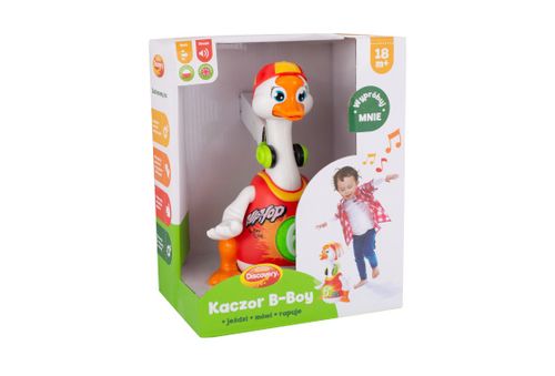Hej maluchu, chcesz się trochę poruszać? Do zabawy zaprasza Kaczor B-Boy, który tańczy w rytmie 3 piosenek, zabawnie poruszając szyją i wypowiadając zwroty w języku polskim lub angielskim. Gdy ten koleżka napotka na przeszkodę, wycofa się, zmieniając kierunek jazdy. Jeśli Kaczor przejdzie w tryb drzemki, wystarczy chwycić go za szyję i podnieść do góry, aby się obudził. Zabawka przeznaczona dla dzieci od 18 miesiąca życia.