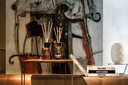 Flakon z ręcznie malowanego szkła, etykieta z żakardu, nasadki – jesionowe lub z drewna orzecha włoskiego„canaletto” (2500, 5000 ml), ze stalową płytką na wierzchu, z lub bez podświetlanej podstawy LED.