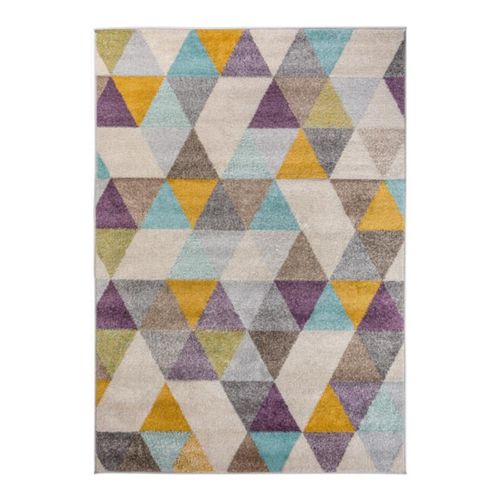 Desert Abstract to ciekawy dywan o abstrakcyjnym i inspirującym wzorze układającym się w strukturę figur geometrycznych. Oprócz wzoru wyróżnia go różnorodna kolorystka, w której dominują odcienie koloru fioletowego, żółtego, turkusowego oraz beżu. Pasował będzie zarówno do jasnych, jak i ciemnych podłóg. Jest bardzo uniwersalny, z powodzeniem rozłożyć go można w pokoju dziecięcym, sypialni, nowoczesnym salonie, a nawet w jadalni. Barwa i wzór dywanu sprawią, że w każdym pomieszczeniu stworzysz przyjemną atmosferę. Stanowi doskonały sposób na szybką i tanią metamorfozę wnętrza. Dywan wykonano z wysokiej jakości polipropylenu Heatset Frise. Jego najważniejsze zalety to m.in.: - sprężystość, odporność na udeptywanie; - specjalny sposób barwienia zapobiegający utracie koloru; - odporność na promienie słonecznie i różnego rodzaju zabiegi pielęgnacyjne; - wysoka dźwiękochłonność; - są bezpieczne dla alergików, ponieważ nie elektryzują się i nie przyciągają kurzu.