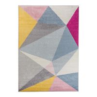 Galaxy to ciekawy dywan o abstrakcyjnym i inspirującym wzorze układającym się w trójkąty. Oprócz wzoru wyróżnia go różnorodna kolorystka, w której dominują odcienie koloru niebieskiego, żółtego, różowego oraz białego. Pasował będzie zarówno do jasnych, jak i ciemnych podłóg. Jest bardzo uniwersalny, z powodzeniem rozłożyć go można w pokoju dziecięcym, sypialni, nowoczesnym salonie, a nawet w jadalni. Barwa i wzór dywanu sprawią, że w każdym pomieszczeniu stworzysz przyjemną atmosferę. Stanowi doskonały sposób na szybką i tanią metamorfozę wnętrza. Dywan wykonano z wysokiej jakości polipropylenu Heatset Frise. Jego najważniejsze zalety to m.in.: - sprężystość, odporność na udeptywanie; - specjalny sposób barwienia zapobiegający utracie koloru; - odporność na promienie słonecznie i różnego rodzaju zabiegi pielęgnacyjne; - wysoka dźwiękochłonność; - są bezpieczne dla alergików, ponieważ nie elektryzują się i nie przyciągają kurzu.