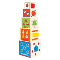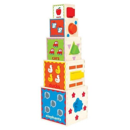 Edukacyjna piramida. Edukacyjna piramida składa się z pięciu drewnianych klocków, które można układać jedno na drugim tworząc piramidkę lub wkładać jedno w drugie. Dodatkowo są wycięte otwory w które można dopasowywać klocki o różnych kształtach.