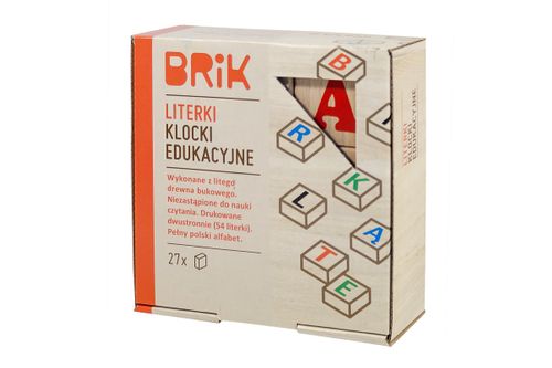 Zestaw zawiera 27 kwadratowych klocków. Litery znajdują się na obu stronach każdego klocka.