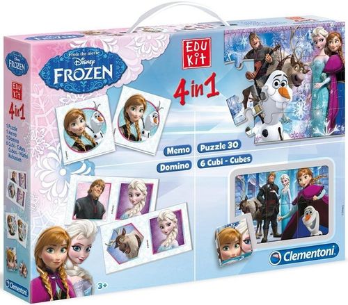 Zestaw Clementoni Edukit 4 w 1.Zestaw składa się z puzzli, klocków, memo oraz domino.W zestawie znajdują się 2 rodzaje układanek: puzzle składające się z 30 elementów oraz klocki- 6 kostek z których można ułożyć obrazki.Do zestawu dołączono również 2 gry: Memo i Domino w tej samej tematyce.