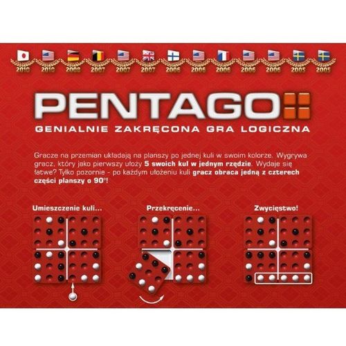 Gracze na przemian układają na planszy po jednej kuli w swoim kolorze. Wygrywa gracz, który jako pierwszy ułoży 5 swoich kul w jednym rzędzie. Wydaje się łatwe? Tylko pozornie, po każdy ułożeniu kuli, gracz obraca jedną z czterech części planszy o 90 stopni! Hit w wielu krajach: 14 zdobytych nagród! Ruchoma plansza!Do gry dołączone jest wieczko umożliwiające zabranie planszy i elementów gry w podróż! Czas gry to ok. 15 minut. Gra przeznaczona: dla 2 graczy w wieku od 8 lat.