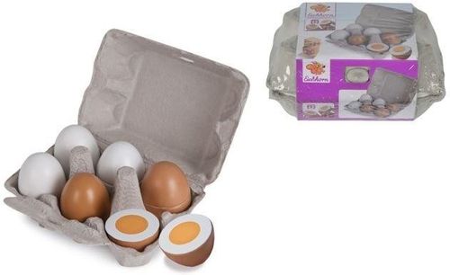 Drewniane jajka pochodzą z cieszącej się coraz większym zainteresowaniem kolekcji Eichhorn od cenionej firmy Simba. W kolekcji tej znajdziemy szereg pięknie wykonanych drewnianych zabawek, które nie tylko bawią, ale przede wszystkim wspomagają rozwój dziecka. Charakteryzują się one precyzyjnym i solidnym wykonaniem oraz żywą, przyjazną dla oka dziecka kolorystyką.Jajeczka są w kolorze białym oraz brązowym i wyglądają bardzo smakowicie. Zostało do nich dołączone kartonowe opakowanie. Dziecko może wcielić się w kucharza, przygotować jajka na twardo albo na miękko i zaserwować je na śniadanie! Wspaniała zabawa gwarantowana! Dzięki zabawce dziecko uczy się rozpoznawać kształty oraz kolory. Rozwija u malucha logiczne myślenie oraz koordynację ruchową. Zabawka jest w zupełności bezpieczna dla dziecka.