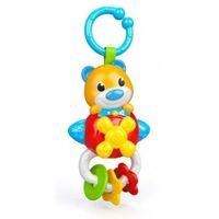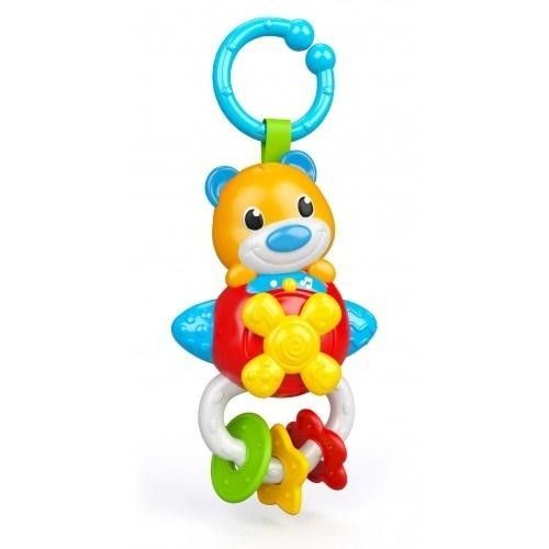 Elektroniczna grzechotka z pluszowym misiem . Wesoła elektroniczna grzechotka w kształcie latającego samolotu z pilotem pluszowego misia, który widzi najmłodsze dzieci! Gdy helikopter obraca się, dzieci mogą słuchać wielu zabawnych dźwięków i wesołych melodii. Trzy wiszące na uchwycie wisiorki wykonane są z miękkiego plastiku, dzięki czemu idealnie nadają się do ukąszenia dziecka. Grzechotka ma praktyczny pierścień, który wisi na wózku.