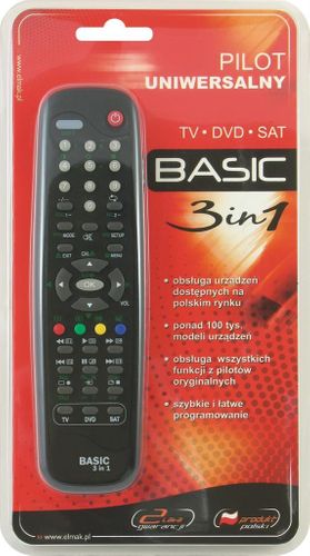 Cechy produktu: Pilot Basic 3in1 może obsługiwać jednocześnie 3 urządzenia: telewizor, tuner satelitarny lub deko zawiera dane o ponad 150 000 urządzeń oraz 30 000 typów pilotów obsługa 100% funkcji z pilotów oryginalnych możliwość wielokrotnego programowania Baza kodów przygotowana na rynek polski i europejski po wyjęciu baterii pamięta wprowadzone kody EAN: 5905106071594 Więcej informacji: Zasilanie: 2x AA