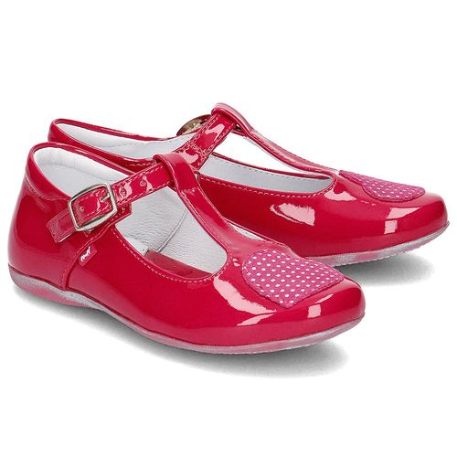 Delikatne buty wykonane ze skóry naturalnej modnie lakierowanej w dziewczęcym różowym kolorze. Przód na pasku zdobi oryginalna naszywka.