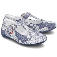 Delikatne buty wykonane ze skóry naturalnej w ciekawy, biało-niebieski wzór.