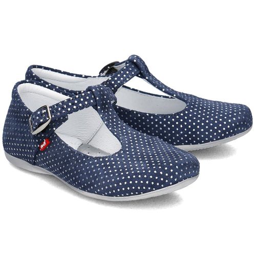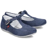 Delikatne buty wykonane ze skóry zamszowej w granatowym kolorze z modnymi, połyskującymi kropeczkami.