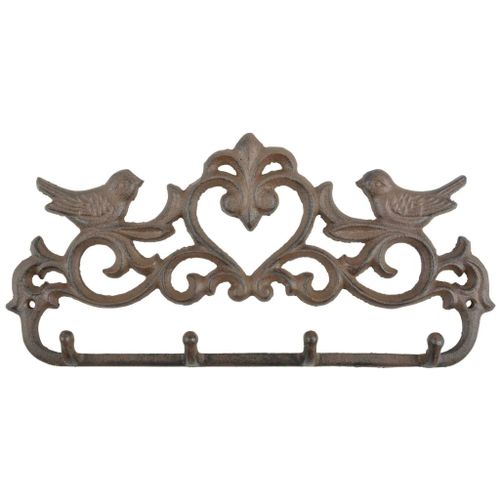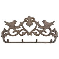 Produkt jest przyozdobiony parą figurek ptaków oraz kwiecistym wzorem. Posiada cztery haczyki na płaszcze, czapki oraz inne akcesoria czy nawet ręczniki kuchenne. Ten wieszak ścienny firmy Esschert Design jest dostarczany w kolorowym pudełku prezentowym i ma dwa otwory montażowe.