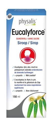 Syrop Physalis Eucalyforce® zawiera kombinację ekstraktów roślinnych i olejków eterycznych (eukaliptusa, mięty, sosny i tymianku), które wspierają górne drogi oddechowe. Zawiera również ekstrakt z propolisu.