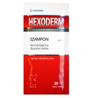 Hexoderm jest dermokosmetykiem weterynaryjnym, regulującym mikroflorę skóry, stabilizującym jej pH oraz zapobiegającym wysuszaniu poprzez pozostawienie cienkiej warstwy tłuszczowo-białkowej. Zawarte w płynie łagodne środki myjące pozwalają na jego częste stosowanie. Wskazania:Pielęgnacja skóry przy właściwej terapii stanów zapalnych. Środki ostrożności:Unikać kontaktu z oczami. Stosowanie: Wstrząsnąć przed użyciem. Zmoczoną sierść i skórę polać szamponem, rozprowadzając go równomiernie po całym ciele, umyć i spłukać. Czynność powtórzyć pozostawiając szampon na sierści i skórze przez 5-10 minut. Stosować codziennie lub w zależności od potrzeb.