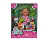 Evi w uroczym stroju safari z 3 zwierzątkami, lornetką, jedzeniem i butelką.