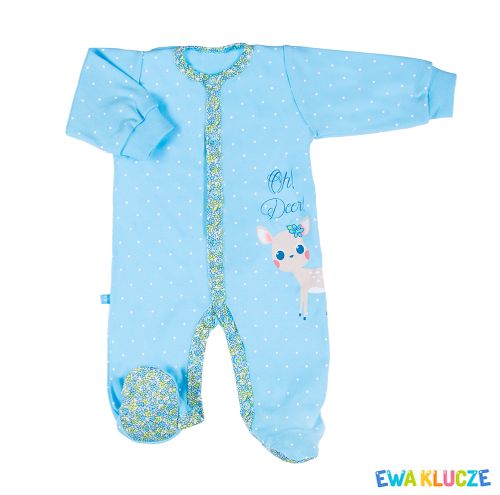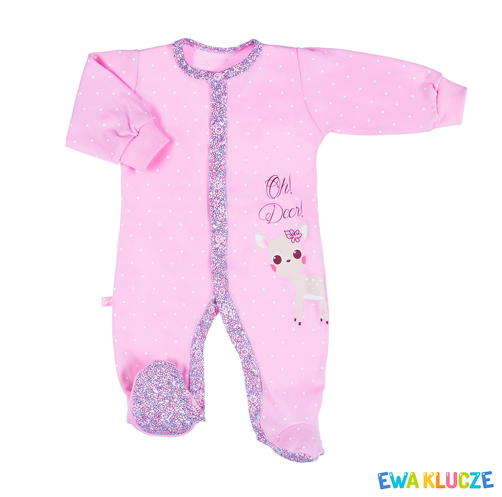 Pajac z kolekcji "Candy" w dwóch zestawach kolorystycznych, uszyty z miękkiej i przyjemnej w dotyku dzianiny w kropeczki, przełamanej drukami kwiatuszków. Z przodu znajdują się druki przedstawiające wesołą sarenkę, wykonane farbami ekologicznymi. Krój umożliwia całkowite rozpięcie, przez co ubranko jest funkcjonalne i wygodne. Wykończony miękką lamówką. Napki użyte w naszych wyrobach nie zawierają niklu. Wyprodukowany w Polsce, posiada certyfikat "Bezpieczny dla dziecka". 100% bawełna